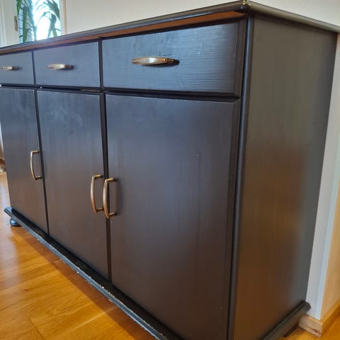 Myydään teak-senkki. Liukuovet. Ajan myötä pientä kulumaa.