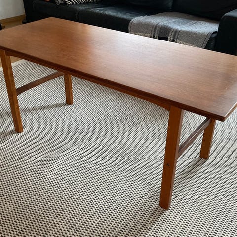 Tumma puuviilupinta, vanerilevyrunko ja levy, jalat puusta sorvatut. Hyllylevy ei paikallaan kuvassa. Jämäkkä rakenne. Haukipudas.