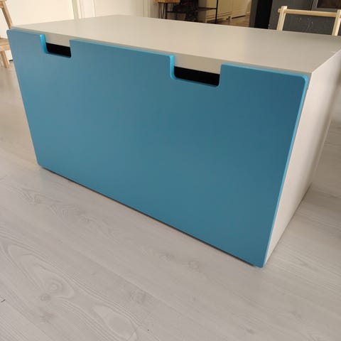 Hyväkuntoiset kalusteet seuraavalle käyttäjälle, jonkin verran käytön jälkiä toki löytyy. Käytetty kokonaisuutena vierekkäin, joten muutama ruuvin reikä kyljessä siinä kohtaa, mistä ruuvattu yhteen. Kaappi-laatikosto koostuu yhdestä rungosta. Hyllykkö ja sen alla oleva laatikosto ovat erillisiä, mutta ne saa kiinnitettyä päällekkäin.