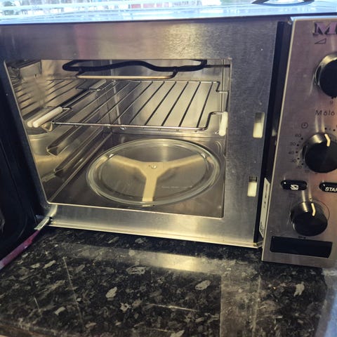 Logik mikroaaltouuni teräs. Vapaasti sijoitettava malli mekaanisilla säätimillä. Laitteessa on kaksi pyörösäädintä tehon ja ajan valintaan sekä sisällä lasinen pyörivä lautanen.