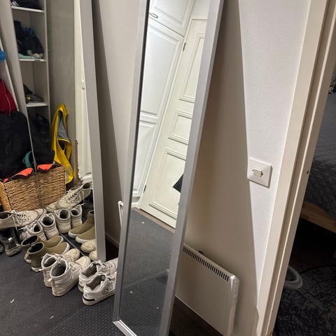 Ikean Godmorgon peili. Koko n. 60x96cm. Kiinnikkeet hukkuneet johonkin, eli vaikka tason päälle jos laittaa nojaamaan niin vielä käyttökelpoinen. Takana maalarinteipin jämiä.