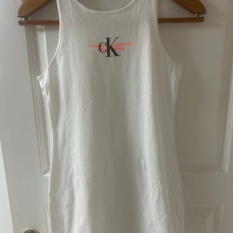 Calvin Klein hyväkuntoinen mekko, XS. Alla valkoinen alusmekko, päällä ohut päälliskangas, valkoisen ja persikan väreissä. Pk 6,90.