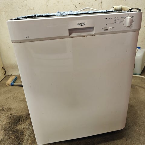 Iäkäs, mutta siisti ja toimiva astianpesukone. Leveys 60cm. Parin alakorin rullan kiinnitys varmistettu nippusiteellä, muuten ok.