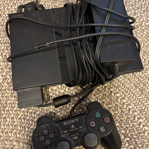 Sony PlayStation 2 Slim konsoli ohjaimilla ja peleillä