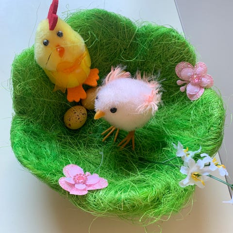 Mukaan vielä pala vihreää kreppipaperia sekä avaamaton pakkaus valkoisia pompom-palloja esim. pupujen hänniksi.