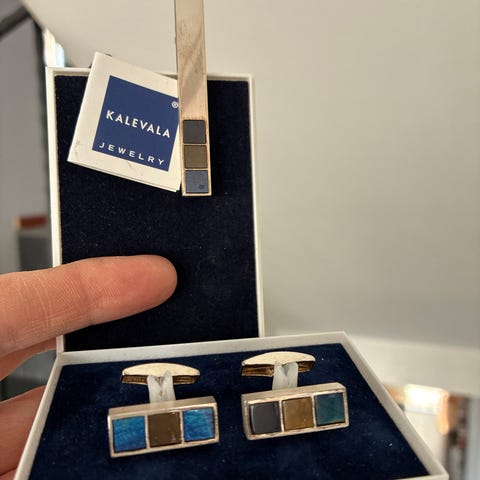 Kalevala kalvosinnapit miehille. Materiaalina hopea. Kalvosinnapeissa on suorakaiteen muotoinen muotoilu ja spektroliitti keskellä.