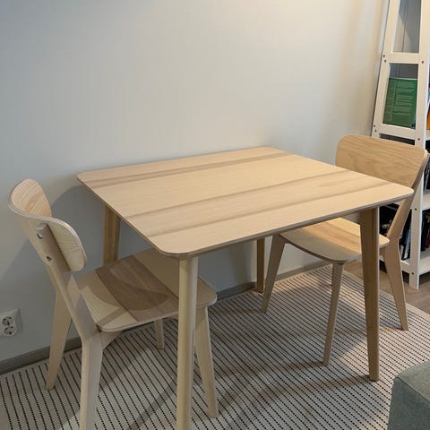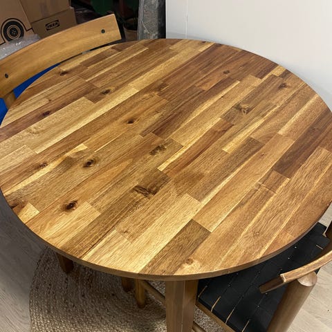 Akaasiapuinen, todella kaunis ja vähän käytetty ruokailuryhmä, johon kuuluu pöytä ja kaksi tuolia. Pyöreän pöydän halkaisija 80cm, sopii 2-4 hengen ruokapöydäksi. Pöytä ja tuolit massiivipuuta. Ollut mökkikäytössä, ei lemmikkieläimiä.