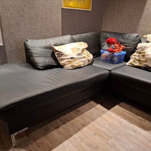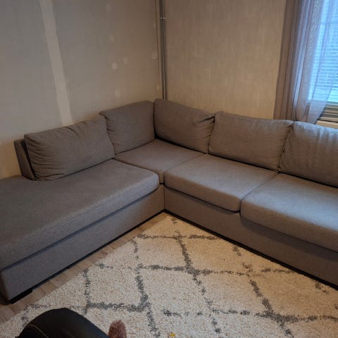 Kulmasohva tumman harmaa. Leveys 260 cm ja rahiosuun 2m.