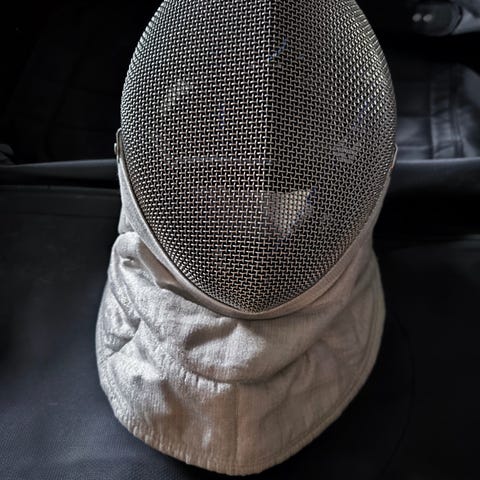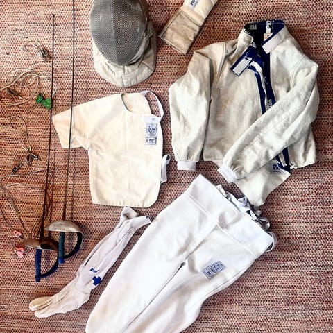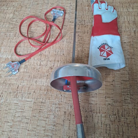 Täys miekkailu setti koossa 52. Sopii esim 4-6 luokkalaiselle. Mukana tulee kypärä, hanska, housut, takki, liivi, johto, miekka (floretti) ja varustekassi