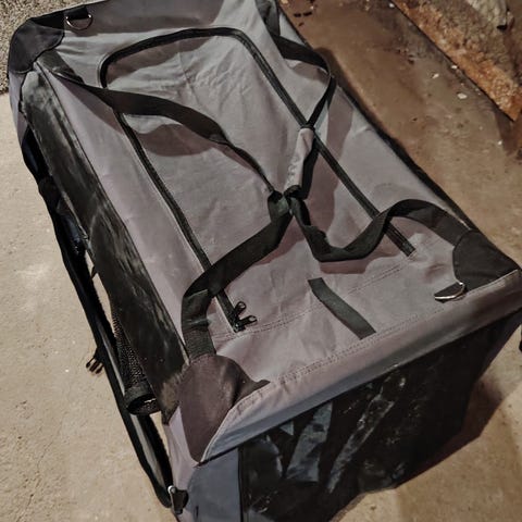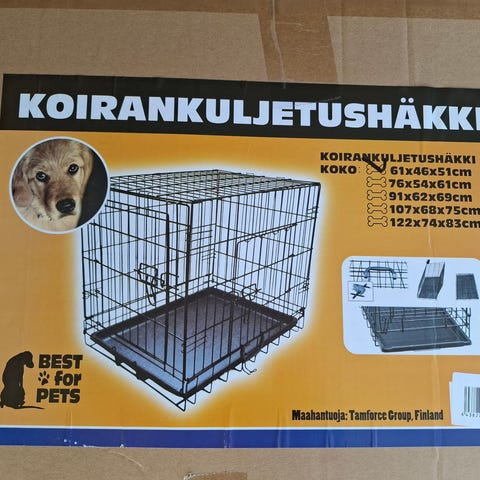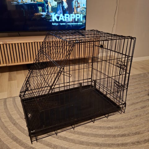 Hyväkuntoinen koiranhäkki kahdella ovella. Taittuu kasaan ja näppärä kuljettaa paikasta toiseen.
