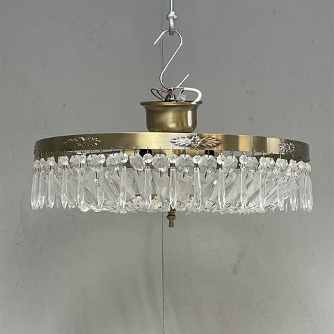 Kattokruunu, jossa on useita pieniä kristalliketjuja ja krominen runko. 11-led valopistettä. Valmistaja on Ideal Lux, ja malli Augustus SP12 Cromo. Valaisin on suunniteltu Italiassa.