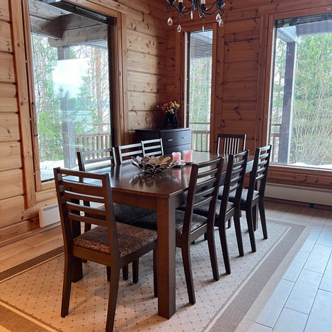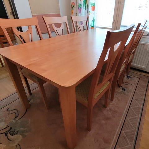 Puinen ruokailuryhmä, johon kuuluu suorakulmainen levitettävä ruokapöytä ja kuusi tuolia. Pöydässä on tummasävyinen puupinta ja pyöristetyt reunat. Tuoleissa on puurunko, kaarevat jalat ja koristeelliset selkänojat. Istuimissa ja selkänojissa on pehmustettu, roosanvärinen, kuviollinen kangasverhoilu nappikoristelulla. Ryhmä soveltuu ruokailutilaan tai olohuoneeseen useamman hengen istumapaikoiksi.