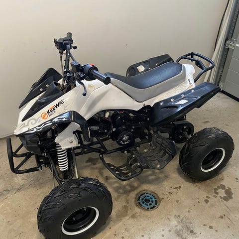 Ei rekisterissä oleva, ulkoasultaan siisti kiinan mönkijä meille tarpeettomana. Vika: aina ei heti ensimmäisellä kerralla lähde läyntiin.
