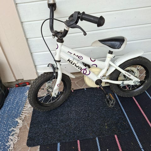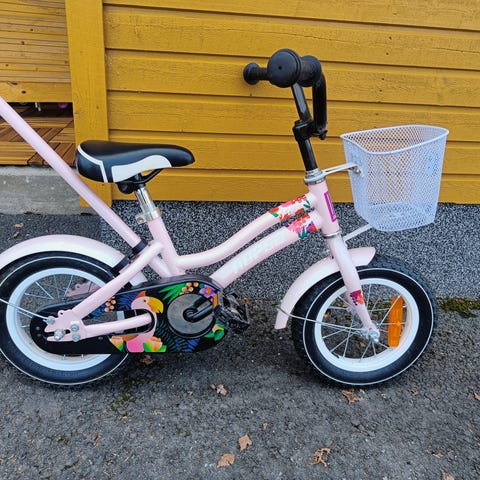 Dino Bikes lasten polkupyörä 12". Pyörässä on 12 tuuman renkaat, apupyörät, ketjusuoja sekä jalkajarru. Rungon väri on pinkki valkoisilla ja monivärisillä yksityiskohdilla. Satula ja käsigripit ovat vaaleat. Etuosassa on pieni kori ja takana istuimen kaltainen kuljetusteline pehmolelulle tai nukelle. Soveltuu pienille lapsille ensipyöräksi, kunhan mitat ja ajoasento tarkistetaan käyttäjän pituuden mukaan.