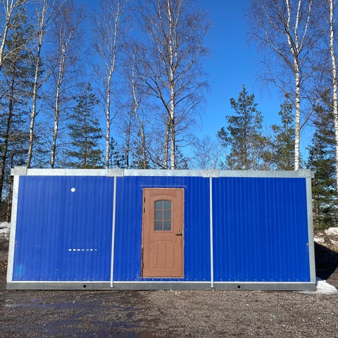 Sininen toimistokontti, jossa on useita ikkunoita ja ovi. Kontti soveltuu toimisto- tai taukotilaksi. Sisätiloissa on pieni keittiövarustus, johon kuuluu allas, liesitaso ja kaapistot. Wc, suihku. Sähköpatterit, poistoilmapuhallin. Ulkopuolelta kontissa on nosto- ja kiinnityspisteet siirtämistä varten. Kontti on suunniteltu käytettäväksi tilapäisenä työ- tai sosiaalitilana työmailla tai muissa kohteissa. Ulkomittat 9.1 x 2.43m kork. 2.8m.