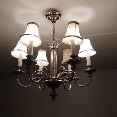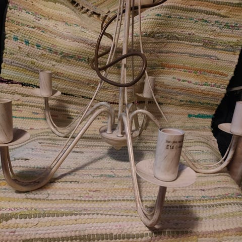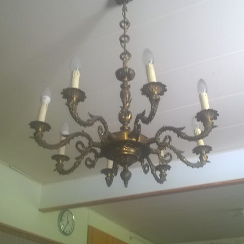 Vanha kattokruunu, johdot uusittu sekä nykyaikainen pistotulppa. Neljä valopistettä.