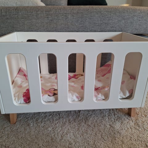 Myydään nuken sänky ja patja. Pituus 57 cm, leveys 28cm. Päädyn korkeus 30 cm. Sopii esim. Baby Bornille. Edellinen omistaja maalannut sängyn melko huolettomasti mutta ainakin meidän nuket on silti saaneet unenpäästä kiinni :D