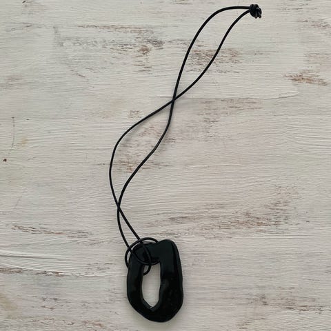 Korussa on suuri keraaminen riipus, joka on ripustettu aidosta nahastavalmistettuun nauhaan.