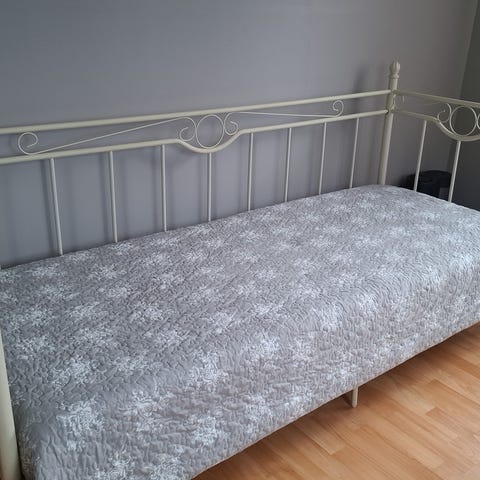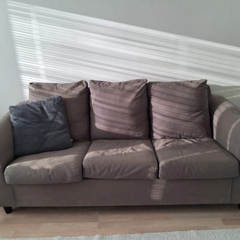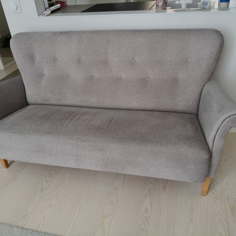 Siitä jonkun kotiin tai vaikka autotalliin elämää nähnyt v. 2019 ostettu divaanisohva. Annetaan pois uuden tieltä. Sohva on hyvä istuttava. Toinen käsinoja pettänyt, ei kuitenkaan repsota eikä ulospäin näy. Divaaniosassa arkkusäilytys, kätevä ja hyvin tilaa. Divaanin ja toisen kappaleen väliltä kangas revennyt, välissä niin ei pahasti näy. Voinee sohvanpäällisen hankkia jos vaivaa. Vuodeosan saa vedettyä sohvan alta. Siitä kiinnikkeet hajonneet, joten vuodeosa lähtee kokonaan irti. Voit rullailla vaikka toispuolen kämppää.
