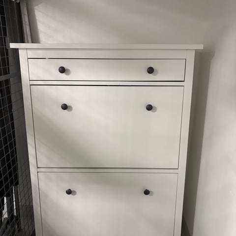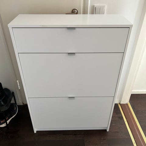 Erittäin hyväkuntoinen, Ikean Brusali kenkäkaappi. Kaikki lokerot saman kokoiset. Kiinnitettävä seinään. Vähän kulumaa, kuvista näkyy missä kohdissa. Ollut koira&kissataloudessa.