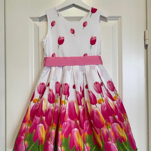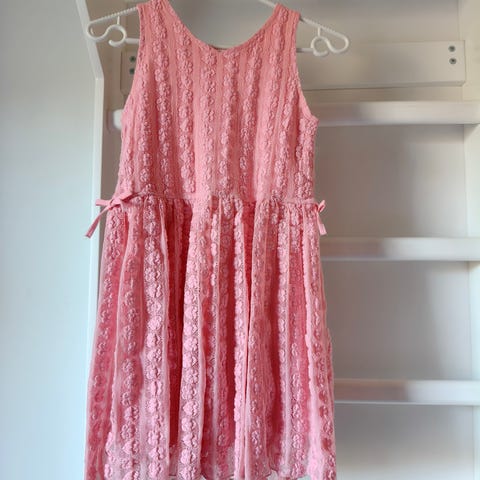 Vaaleanpunainen juhlamekko laskostetulla helmalla. Koko 122/128cm. Helmassa ruusukuviointi ja takana rusetti. Selästä hieman matalampi. Joustava yläosa.