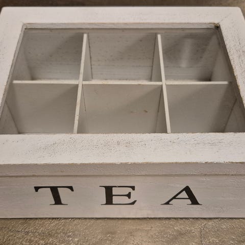 Valkoinen posliininen teline / tarjoiluastia teepusseille, astiaan ladotaan teepussit ja teepussi otetaan alaosan aukosta, hyvin siisti.