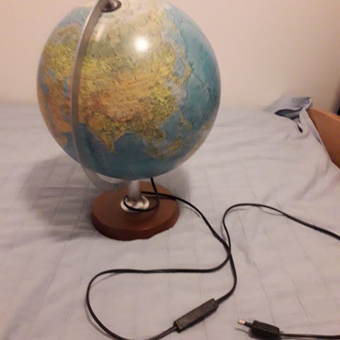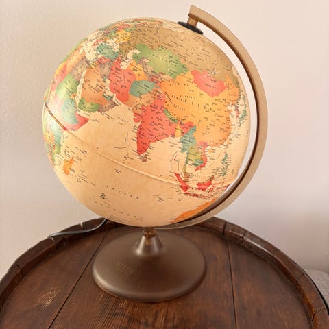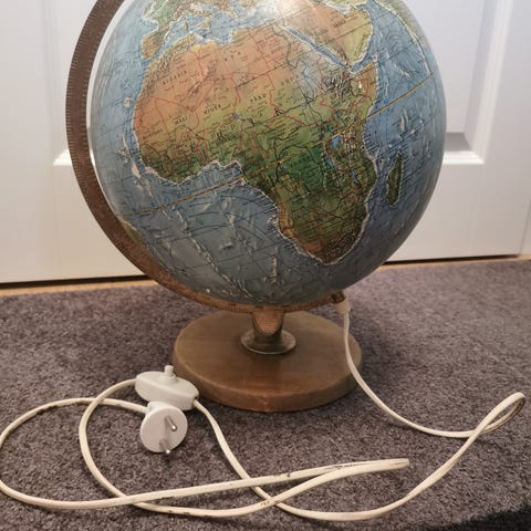 Hyväkuntoinen suomen kielinen vintagekarttapallo valaisimella.