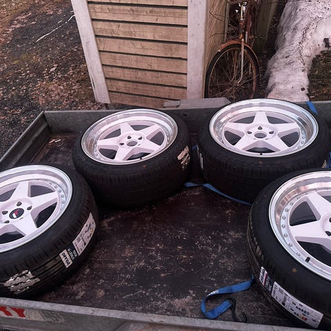 Hyväkuntoiset vanteet kohtalaisilla kumeilla, joista 2 kpl sakoilla. Ei ole ajettu kanttareille yms