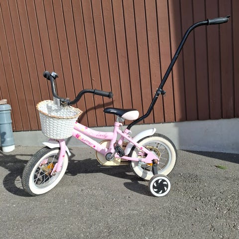 Lasten polkupyörä, jossa 12" renkaat. Rungon pääväri on sininen, ja pyörässä on valkoinen satula sekä vaaleat käsigripit. Pyörässä on apupyörät ja työntöaisa, jotka helpottavat ajamisen opettelua. Edessä on heijastin ja soittokello ohjaustangossa. Soveltuu pienille lapsille ensimmäiseksi polkupyöräksi. Kahdella lapsella käytössä ollut, pihakatoksessa säilytetty. Käsikahvat vaativat kunnon pesun tai uusimisen.