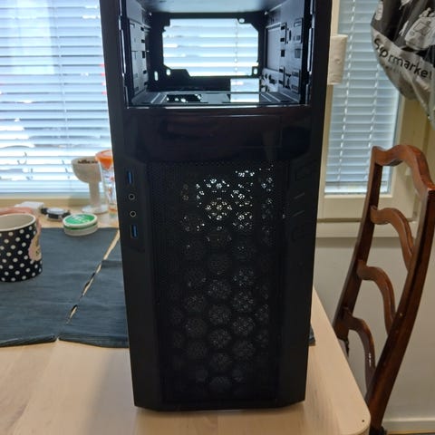 ATX-tietokonekotelo. Etupaneelissa 3 5,25" . Sopii pöytätietokoneen rungoksi tai varaosakäyttöön. Koteloon on kiinnitetty tarroja etupuolelle. Tyhjä kotelo, kaksi kotelotuuletinta etuverkossa, jossa pölysuoja. Alta puuttuu kumijalustat.