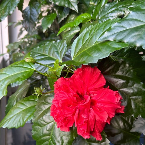 Vanhankannan kiinanruusu hyvässä kasvussa. Kukkii punaisin kukin. Tekee jo paljon sivuversoja.