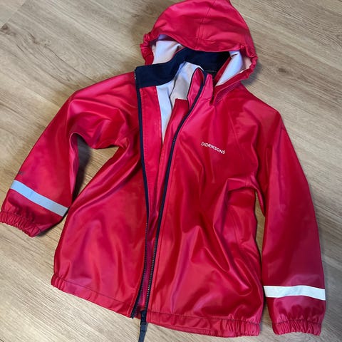 Didriksons kelta-vihreä sadeasu (sadetakki ja kurahousut) koossa 130.