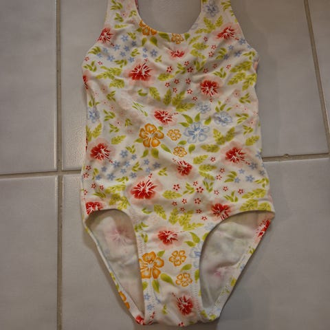 Erittäin hyvässä kunnossa oleva jäätelö-kuvioinen kimaltavilla pisteillä oleva uimapuku. Uimapuvussa säädettävät olkaimet jolla kokoa voi säätää. Pesulappu napsastu pois, joten en näe kokoa. Vastaa koko 92-98+säätövarat päälle.