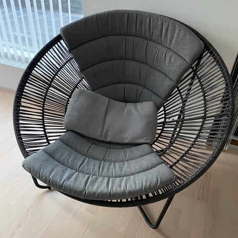 Musta narumuotoinen nojatuoli, jossa pyöreähkö, syvä istuinosa ja metallijalat. Istuinosan rakenne muodostuu tiheästi vedetyistä muovinauhoista. Tuoli soveltuu ulko- ja sisäkäyttöön. Ollut aina sisäkäytössä. Rungon materiaali on metallia ja pinta mustaksi maalattu. Narumainen istuinosa on mustaa muovia, joka on kierretty tukevasti rungon ympärille. Kissa raapinut hieman, mutta edelleen ehyt.