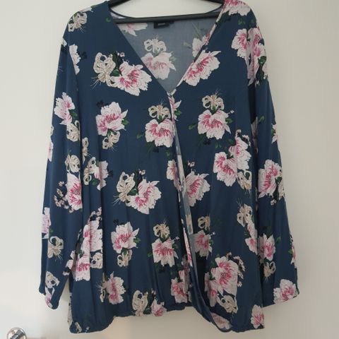 Pola paita naisille, koko XL. Väriltään musta, jossa vaakasuuntaiset vaaleat raidat. Materiaalina pääosin viskoosi sekoitteena muun kuitumateriaalin kanssa. Malliltaan väljä ja hieman A-linjainen, 3/4-pituiset leveät hihat.