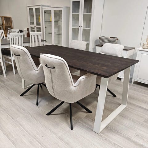 Aikaa kestävät, huonekaluvalmistaja Anttiinan Swing ruokapöytä 190 x 90 cm kaluste on valmistettu käsityönä kestävästä umpipuusta ja Suomessa. Upeassa metallijalkaisessa pöydässä on umpipuinen ruskea värinen koivukansilevy. Swing-pöydän näyttävät metalliset valkoisen väriset viistejalat.