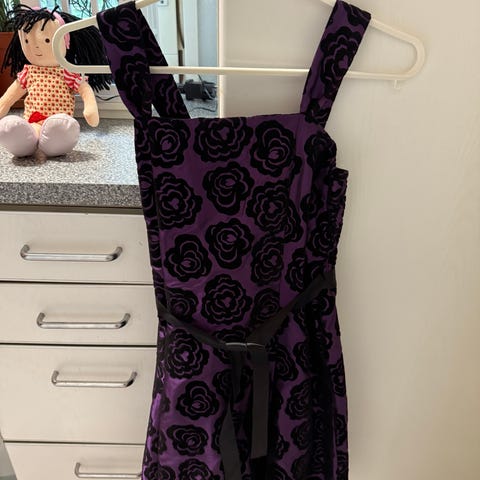 Nätti, tahraton ja ehjä mekko. Violettikangas samettinen. Allergiavapaa talous.