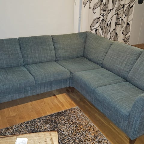 Harmaa kangasverhoiltu kulmasohva. Sohva on kolmen istuttava. Selkänojassa on kolme irrallista selkätyynyä ja käsinojat molemmissa päissä.