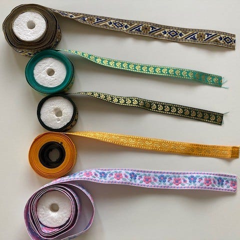 Kaunis kansanomainen koristenauha, pirtanauha. Leveys 24 mm. Koneellinen kudonta, polyesteri.