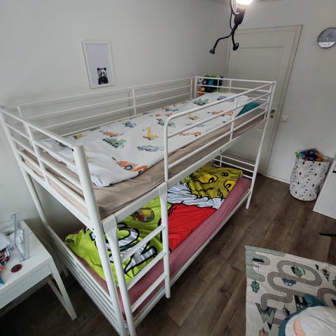 IKEA kerrossänky harmaalla rungolla ja sivusuojilla. Metallirunkoinen sänky, jossa yläpeti ja alapeti sekä kiinteä tikas ylös kiipeämistä varten. Sopii lastenhuoneeseen tilaa säästäväksi nukkumisratkaisuksi. Kuvissa näkyy patjat ja tekstiilit, tarkemmat mitat ja mukaan tulevat osat voi varmistaa myyjältä.