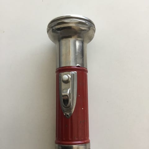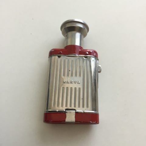 Arras DDR taskulamppu, jossa punainen uritettu runko ja metalliset päädyt. Lamppu on perinteistä mallia, jossa on etupuolella heijastinkupu ja polttimolle paikka. Rungossa on liukukytkin ja painike käyttöä varten. Sopii esimerkiksi keräilyyn tai vara‑ ja retkikäyttöön. Pituus 110 mm, leveys 40 mm, ei patteria