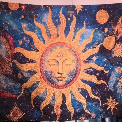 Upea sinisen sävyinen seinäkangas. Hyvä kunto ja kevyttä kangasta; pysyy seinällä ihan Sinitarralla. Koko isohko n 150 x 170