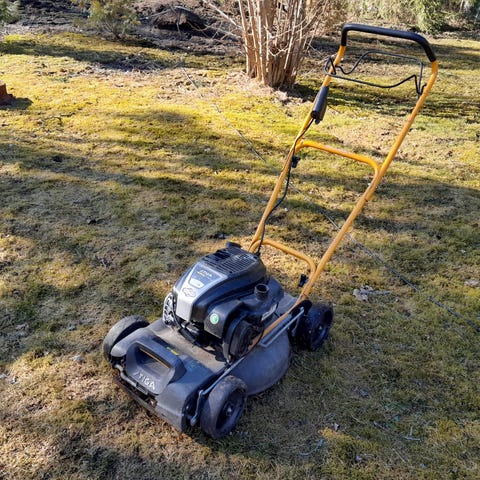 Vetävä Stigan ruohonleikkuri. Ikää kutakuinkin 10 vuotta. Käy ja kukkuu.