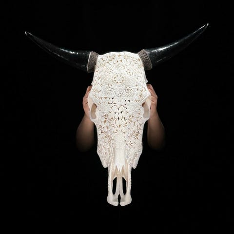 EI VARAUSTA - Upean suurikokoinen ruskea käsin veistetty härän pääkallo -