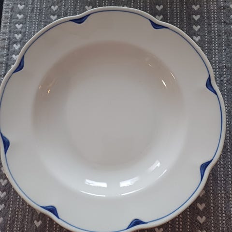 Arabian Pekka sarjaa, tuotannossa 1930-1950 luvulla. Kaksi syvää lautasta (23cm) ja kaksi leipälautasta (18cm). Sininen reuna osittain kulunut, huomioitu hinnassa.