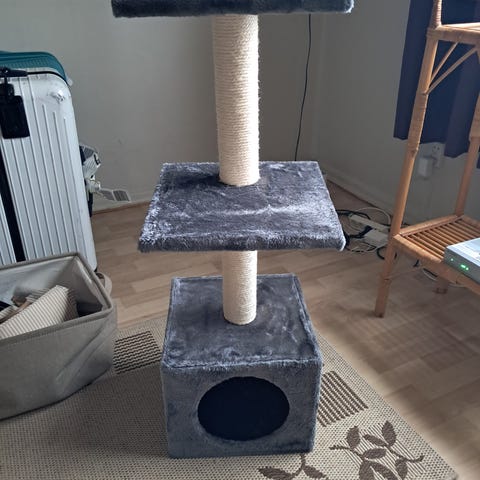 Myydään muuton vuoksi kissankiipeilyteline. Korkeus 150 cm. Jouduttu ottamaan pala pohjalaudasta pois jotta sopi parvekkeella ilmalämpöyksikön alle. Ei haittaa käyttöä.