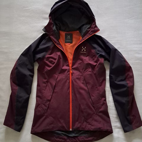 Haglöfs naisten takki, koko S. Kevyt, kevään ja syksyn keleille. Pitkä malli, jossa kiinteä huppu ja vino etuvetoketju. Väri tummanpunainen.
