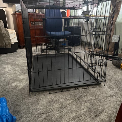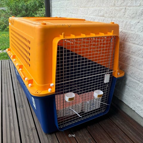 Isohko koppi/häkki pyörillä koiralle, soveltuu lentokoneeseen. Kerran käytetty.
