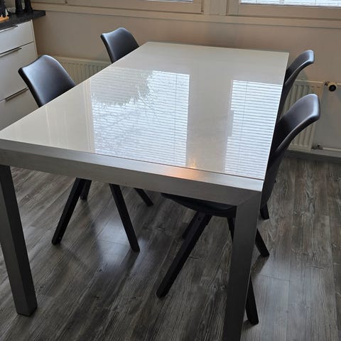 Myydään täyspuupöytä 90 x 140cm, korkeus 72,5cm. Täyspuukansi. Musta valurautajalat (painavat). On nostettuna autotalliin odottamaan uutta omistajaa. En varaa 2h pidemmäksi aikaa. Ei tinkauksia