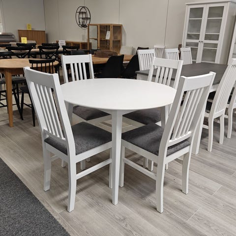 Pyöreän Laine-ruokapöydän retrohenkinen muotoilu kutsuu kokeilemaan ja leikittelemään sisustuksella. Ole rohkea ja päästä luovuutesi valloilleen! Laadukkaan Laine-pöydän runko on kestävää massiivikoivua ja kansi maalattua mdf-huonekalulevyä.